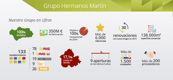 Desde el Grupo Hermanos Martín, estamos muy ilusionados en presentar nuestra primera Memoria de Sostenibilidad. Un documento en el que recogemos todas las acciones que hemos realizado en 2013 para contribuir al desarrollo de nuestro entorno social y medioambiental. Presentamos también todas nuestras cifras, para que conozcáis de primera mano cómo es Grupo Hermanos Martín de una forma totalmente transparente. Somos una empresa 100% andaluza, con un total de 133 establecimientos en nuestra tierra y más de 1.500 empleados. De nuestras tiendas, 78 son Supermercados MAS, 1 es el nuevo modelo de conveniencia MAS&Go , 9 son del modelo Cash Fresh, 9 son Hornos San Tomás y, además, tenemos también 26 cafeterías.
