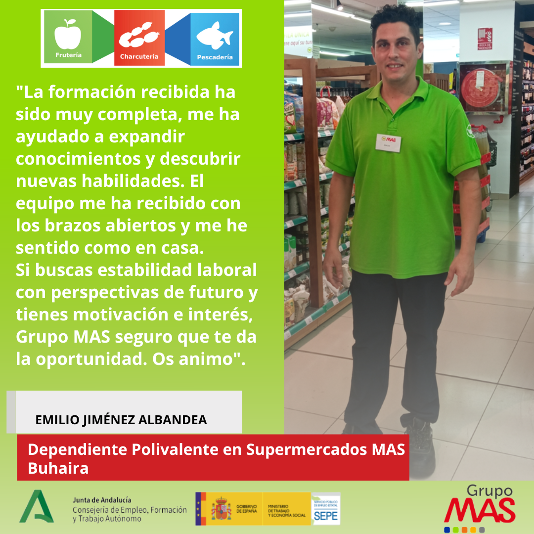 Uno de ellos ha sido nuestro compañero Emilio, que realizó el curso de sección de carnicería y hoy trabaja en nuestro equipo como dependiente polivalente en Supermercados MAS Buhaira (Sevilla):