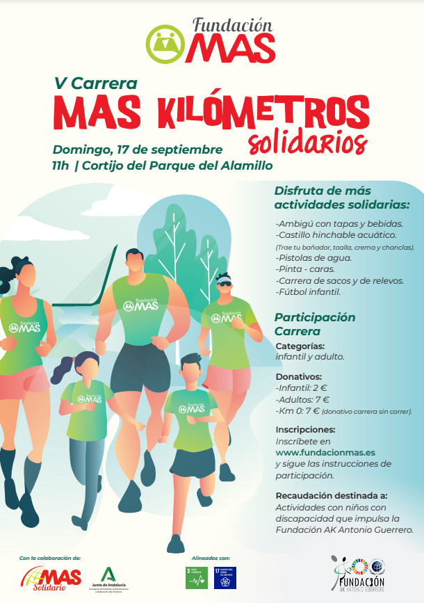 Vuelve la Carrera Solidaria impulsada por Fundación MAS y nuestro grupo de voluntarios MAS Solidario, una actividad destinada a promocionar hábitos de vida saludable entre la ciudadanía y seguir ayudando a quienes más lo necesitan. El próximo 17 de septiembre a las 11:00 h celebramos la V Carrera MAS Kilómetros Solidarios, cuya línea de salida estará situada en el Cortijo del Parque del Alamillo.