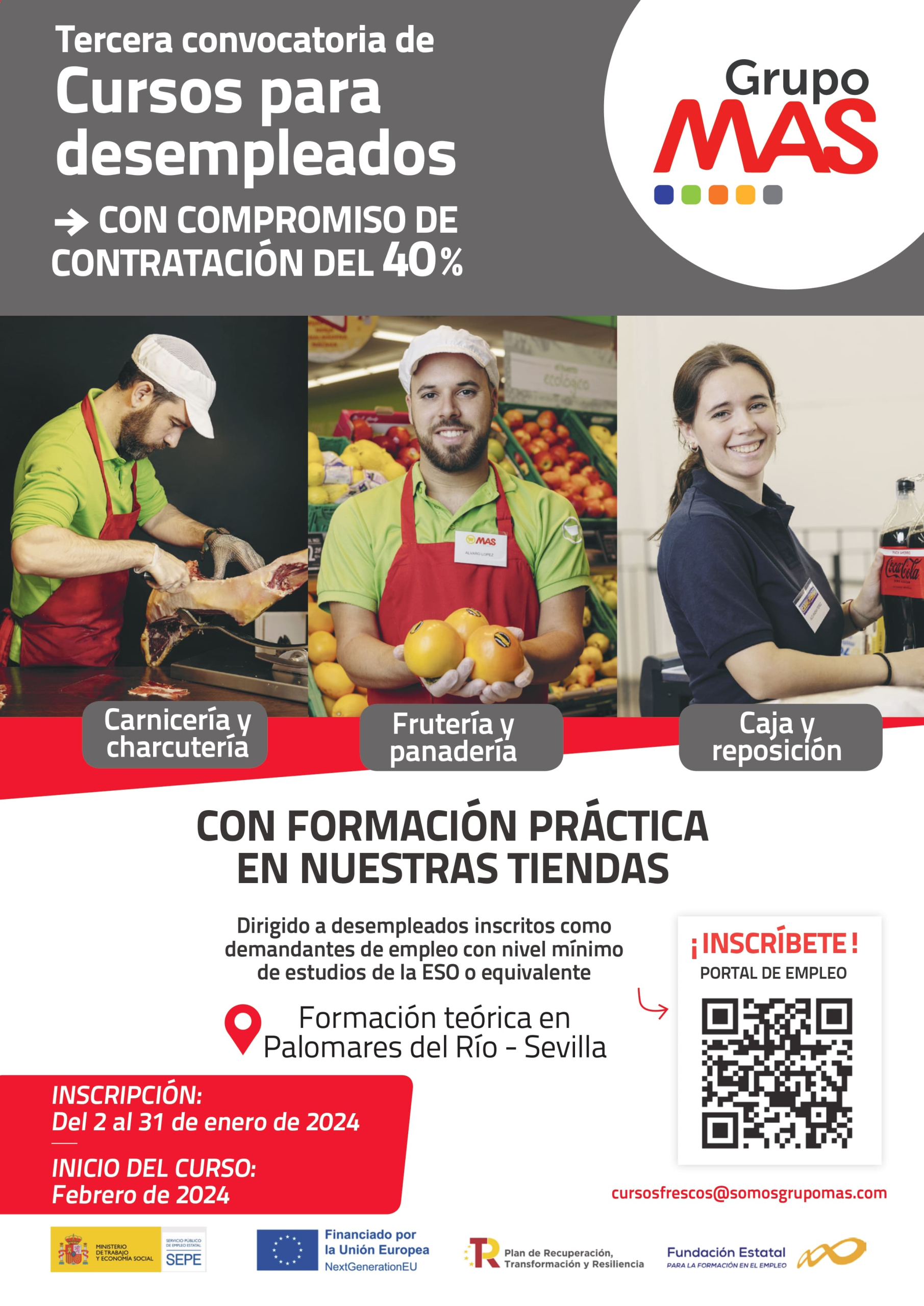 Con el inicio de año, ampliamos nuestra formación y contratación de alumnos, en oficios actualmente muy demandados en el sector, para establecimientos de nuestras enseñas de alimentación (MAS, MAS&Go y Cash Fresh) y hostelería (SanTomás y Altrigo). Hasta el próximo 31 de enero, permanecerá abierto el plazo de inscripción en nuestro Portal de Empleo de esta tercera edición de cursos con compromiso de contratación, que se impartirá de forma teórico-práctica a partir de febrero en nuestro centro de formación ubicado en Palomares del Río (Sevilla) y en tiendas.