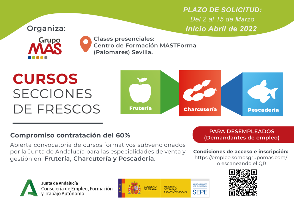 El plazo de presentación de candidaturas concluye el próximo martes 15 de marzo y solo se podrá solicitar una de las especialidades. Los cursos se impartirán de abril a septiembre y se realizarán de forma presencial, en horario de mañana, en nuestro Centro de Formación MASTForma de Palomares del Río. En nuestra apuesta por los productos frescos y su importancia para nuestra tierra, seguimos demandando profesionales en estas secciones y ofrecemos una formación de calidad que les permita incorporarse a nuestra compañía con altas garantías de estabilidad. En Grupo MAS seremos los responsables de la formación de los seleccionados, adquiriendo también el compromiso de contratación del 60% de los participantes que se incorporarán a las plantillas de nuestras marcas de alimentación, Supermercados MAS, MAS&Go y Cash Fresh.