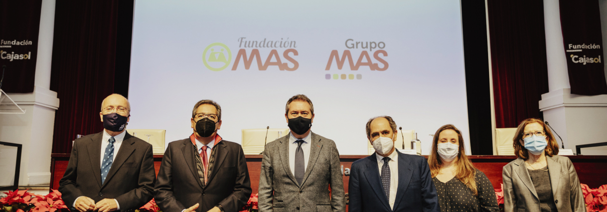 Luis Miguel Pons, director Fundación MAS; Antonio Pulido, presidente Fundación Cajasol; Juan Espadas, alcalde de Sevilla; Vicente Martín, presidente Grupo MAS y Fundación MAS; Cecilia Romero, Coordinadora MAS Solidario, y Emilia Barroso, directora de Bienestar Social del Ayuntamiento de Sevilla.